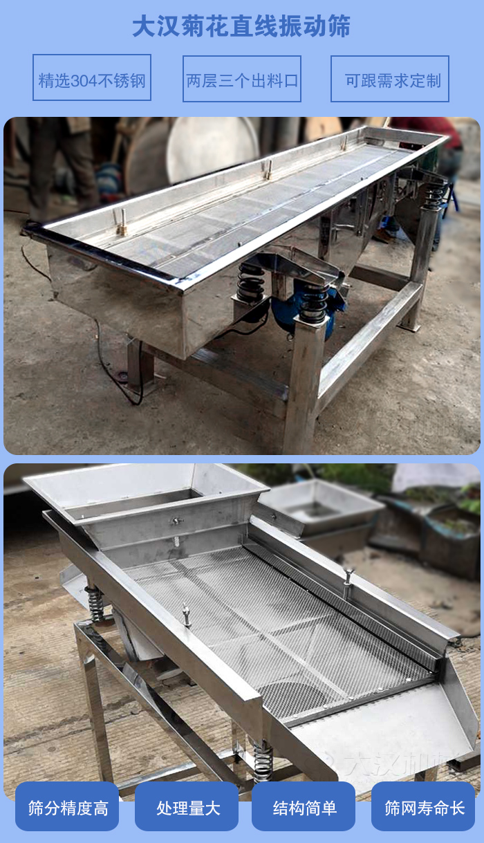 菊花為菊科植物的干燥頭狀花序。主產(chǎn)于浙江、安徽、河南等地。9-11月花盛開時(shí)分批采收,陰干或焙干,或熏、蒸后曬干。生用。藥材按產(chǎn)地和加工方法不同,分為“亳菊”、“滁菊”、“貢菊”、“杭菊”等。由于又有花的顏色不同,又有黃菊花和白菊花之分。 菊花在做成成品之前,需要進(jìn)行除雜分級(jí)。這時(shí)候就需要用到直線振動(dòng)篩,菊花直線振動(dòng)篩篩分精度高,處理量大,結(jié)構(gòu)簡單,篩網(wǎng)使用壽命長,下面有菊花直線振動(dòng)篩廠家大漢機(jī)械為您具體介紹一下菊花直線振動(dòng)篩:
