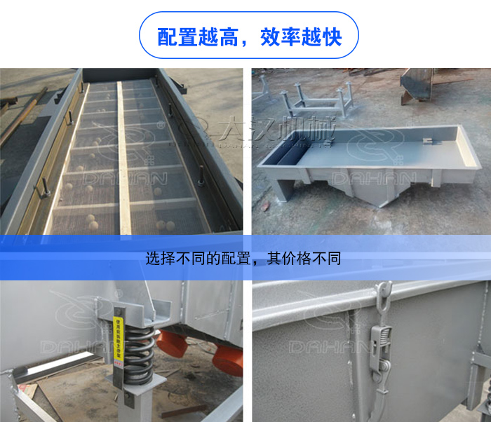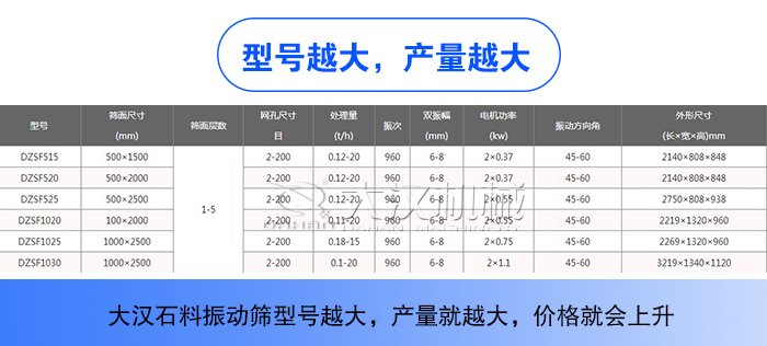 石料直線振動篩主要包括DZSF515、DZSF520、DZSF525、DZSF1020、DZSF1025、DZSF1030,不同型號的石料直線振動篩對應的是不同的產量,大漢石料振動篩型號越大,產量就越大,價格就會上升。般情況下,每相差個型號,石料直線振動篩價格就貴1000元左右。