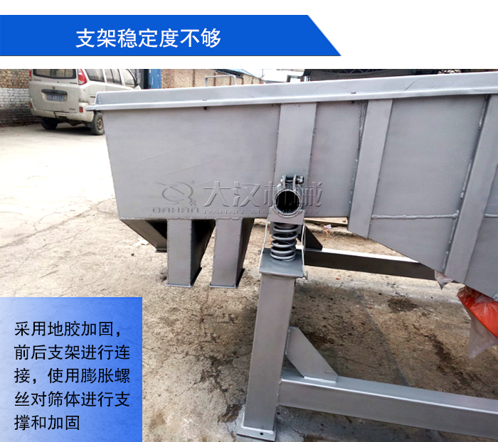 當(dāng)直線振動(dòng)篩支架過于簡(jiǎn)單,就會(huì)導(dǎo)致篩體承受不了足夠的重量,篩機(jī)在工作時(shí),其支架穩(wěn)定性不夠,就會(huì)出現(xiàn)左右搖擺的現(xiàn)象??梢圆捎玫啬z加固,前后支架進(jìn)行連接,使用膨脹螺絲對(duì)篩體進(jìn)行支撐和加固,必要時(shí)可采用水泥澆灌,使直線振動(dòng)篩的作用力作用在地面上。