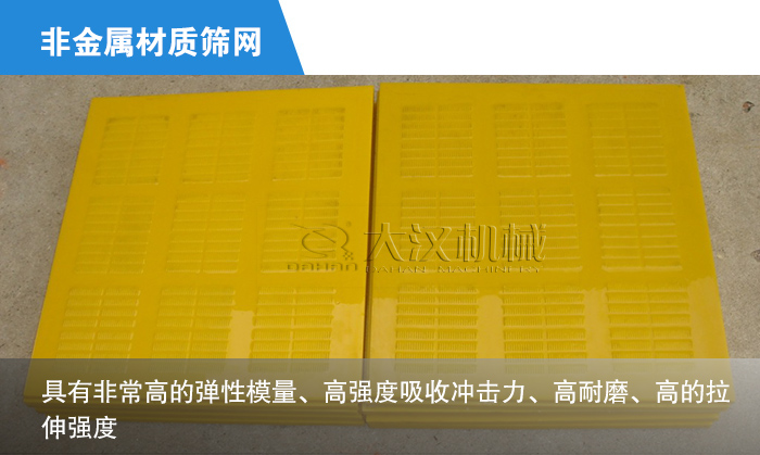 ④非金屬材質(zhì)的振動篩篩網(wǎng)中,聚氨酯為常見,因為聚氨酯本身具有非常高的彈性模量、高強度吸收沖擊力、高耐磨、高的拉伸強度,因此其承載力較高,是橡膠篩板的 2.5 倍以上,使用壽命與普通金屬篩板相比提高8-10倍,是不銹鋼篩面的3倍,是天然橡膠的3.9倍,是當(dāng)前耐磨性能較好的振動篩篩網(wǎng)材料。