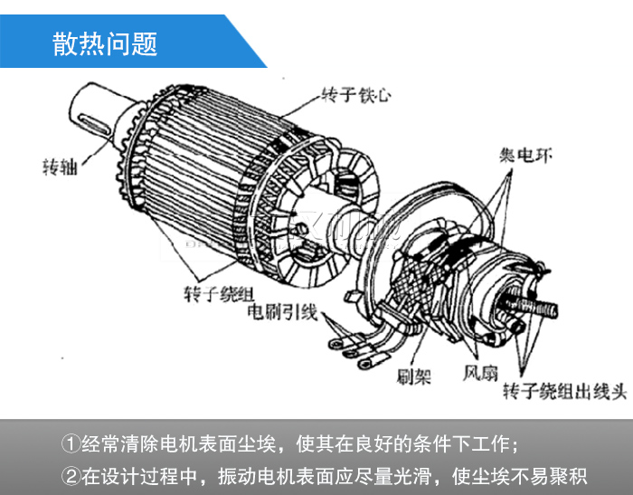 預(yù)防措施:①經(jīng)常清除電機(jī)表面塵埃,使其在良好的條件下工作;②在設(shè)計(jì)過(guò)程中,振動(dòng)電機(jī)表面應(yīng)盡量光滑,使塵埃不易聚積,如果在粉塵較大的環(huán)境下工作,應(yīng)考慮減去機(jī)殼表面的散熱筋,因?yàn)榇藭r(shí),散熱筋不僅起不到散熱作用,反而易使粉塵堆積,阻礙電機(jī)散熱。
