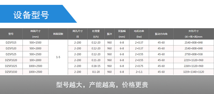 方形振動(dòng)篩型號(hào)有DZSF515、DZSF520、DZSF525、DZSF1020、DZSF1025、DZSF1030,每型號(hào)設(shè)備的篩網(wǎng)面積、機(jī)重、電機(jī)功率,產(chǎn)量等均有差異,因此其制造成本也會(huì)不樣,那么價(jià)格當(dāng)然也是參差不齊,型號(hào)越大,產(chǎn)能越高,價(jià)格更貴。