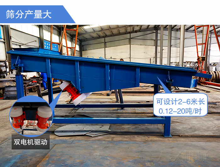 干河沙篩分產(chǎn)量般比較大,這取決于其應(yīng)用場景,直線振動篩為雙電機驅(qū)動,物料在篩面上受激振力的作用向前跳躍,長度根據(jù)精細度要求不等可設(shè)計:2-6米長,干河沙直線振動篩型號有DZSF515、DZSF520、DZSF525、DZSF1020、DZSF1025、DZSF1030,每小時產(chǎn)量范圍在0.12-20噸。